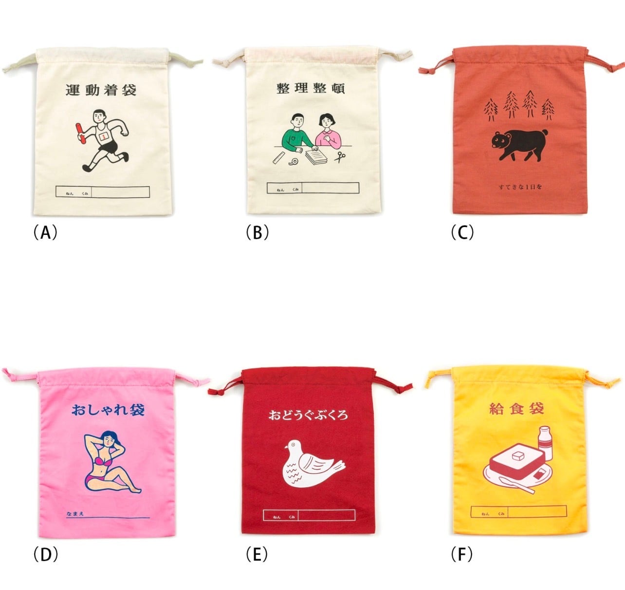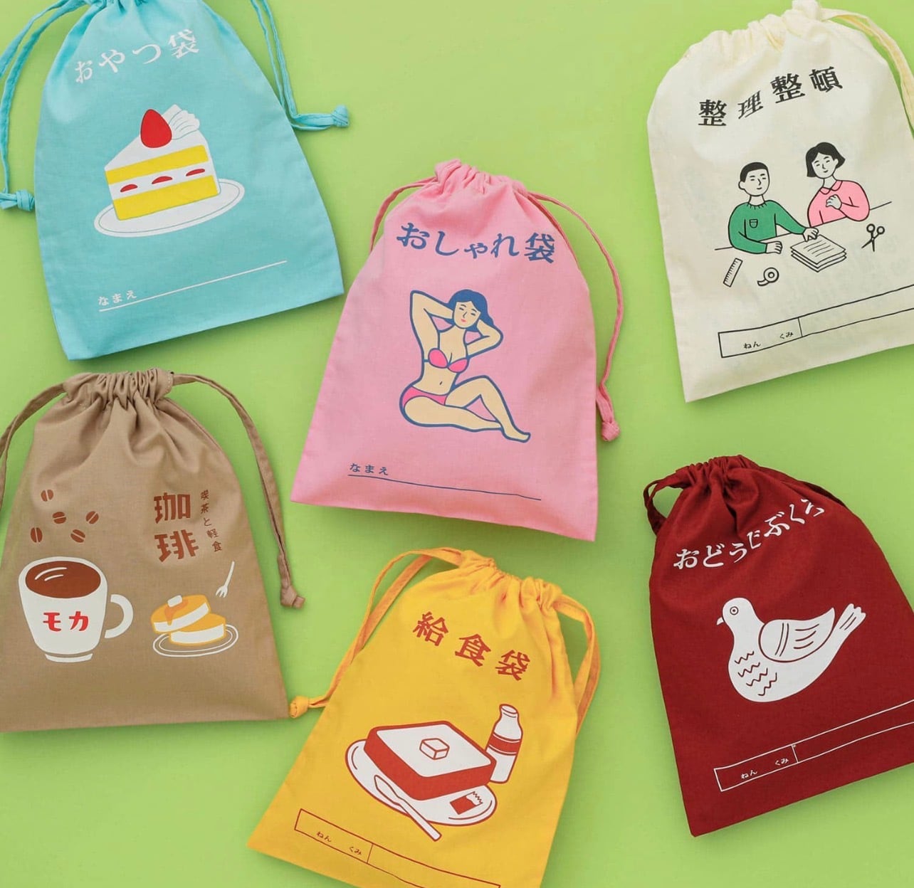 小学生が使っている体操袋を思わせるような様々なタイプの巾着袋。身の回りの小物やおやつを入れたり、鞄の中の仕分け、旅行時の着替え入れなど自由に使えます。