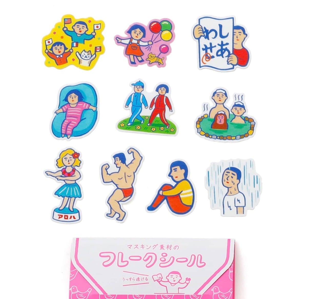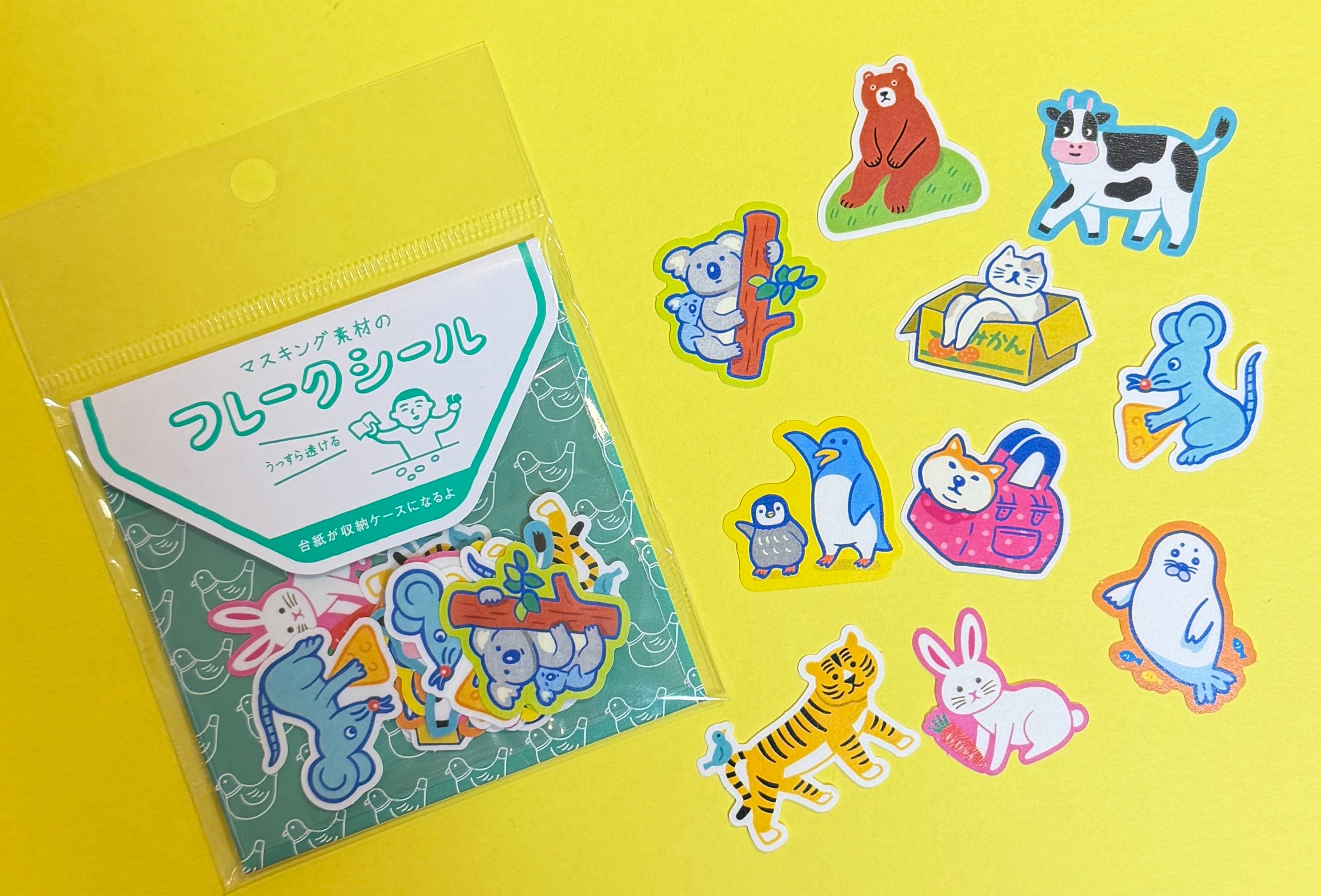ニューレトロのユニークなモチーフが揃ったマスキング素材のフレークシールです。うっすら透ける和紙素材で、たくさん貼ってもかさばりにくいのがポイント。手帳やノート、お手紙など自由に貼ってお楽しみくださいね。パッケージの台紙を折り畳めば保管にも便利な収納ケースになります。