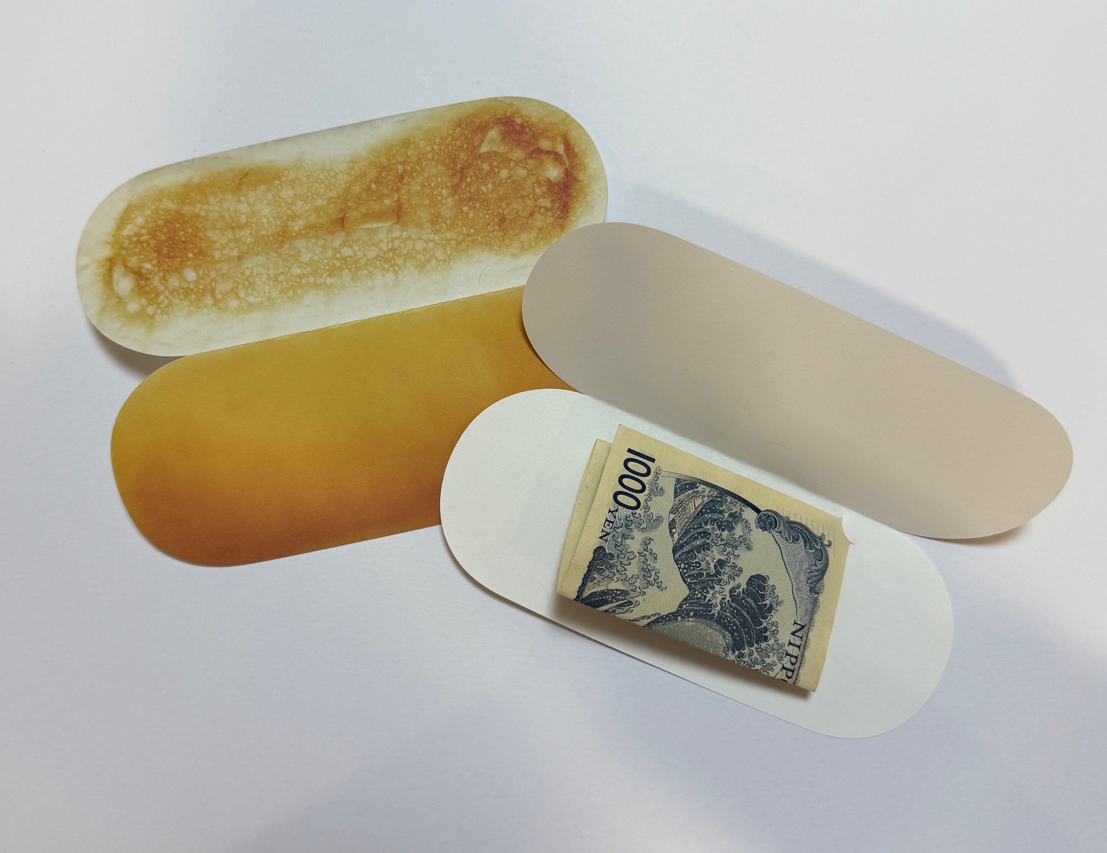 コッペパン型の二つ折りカードの中面下側に三つ折り紙幣を挟むことができるカットラインが入っています。