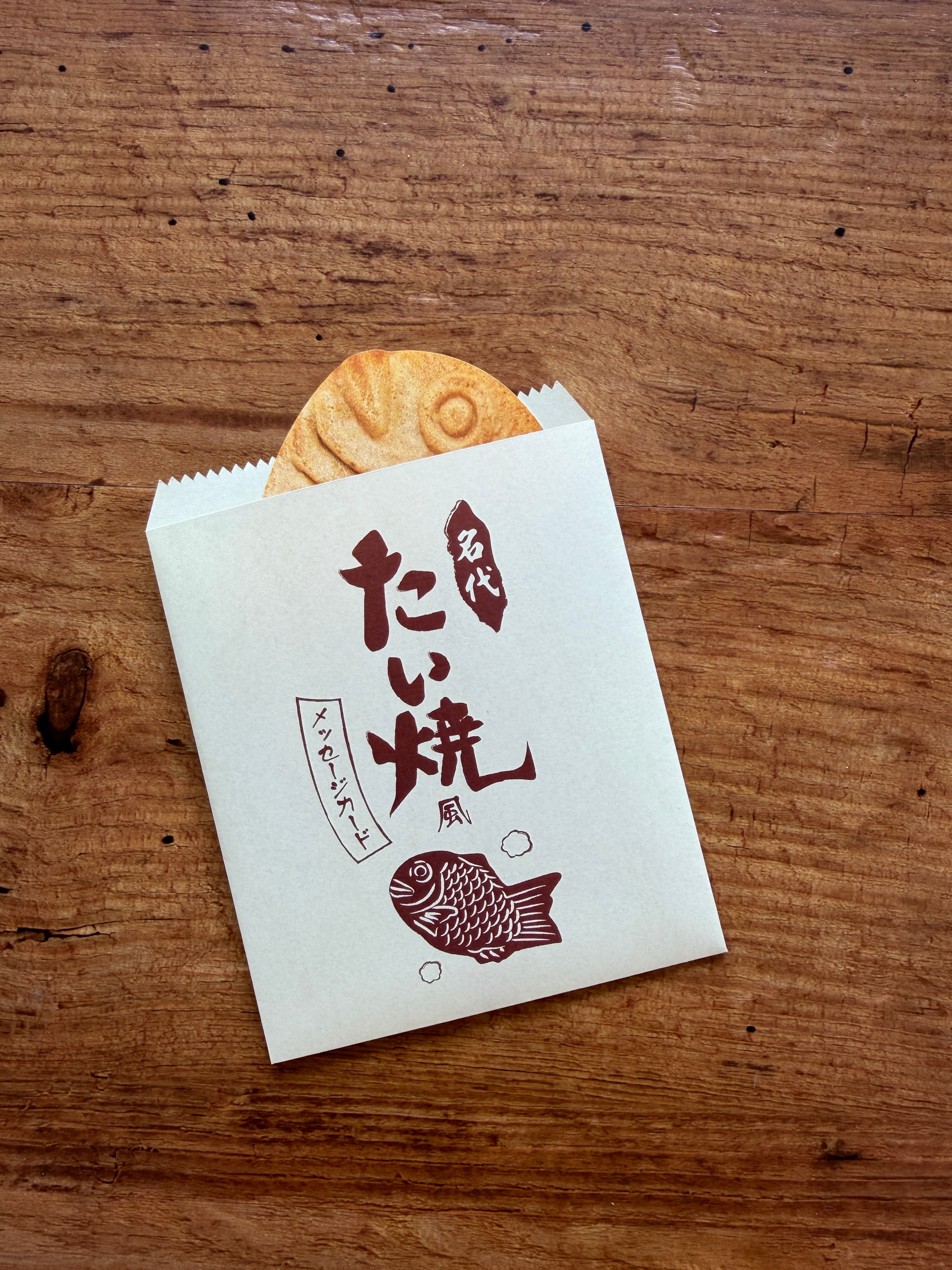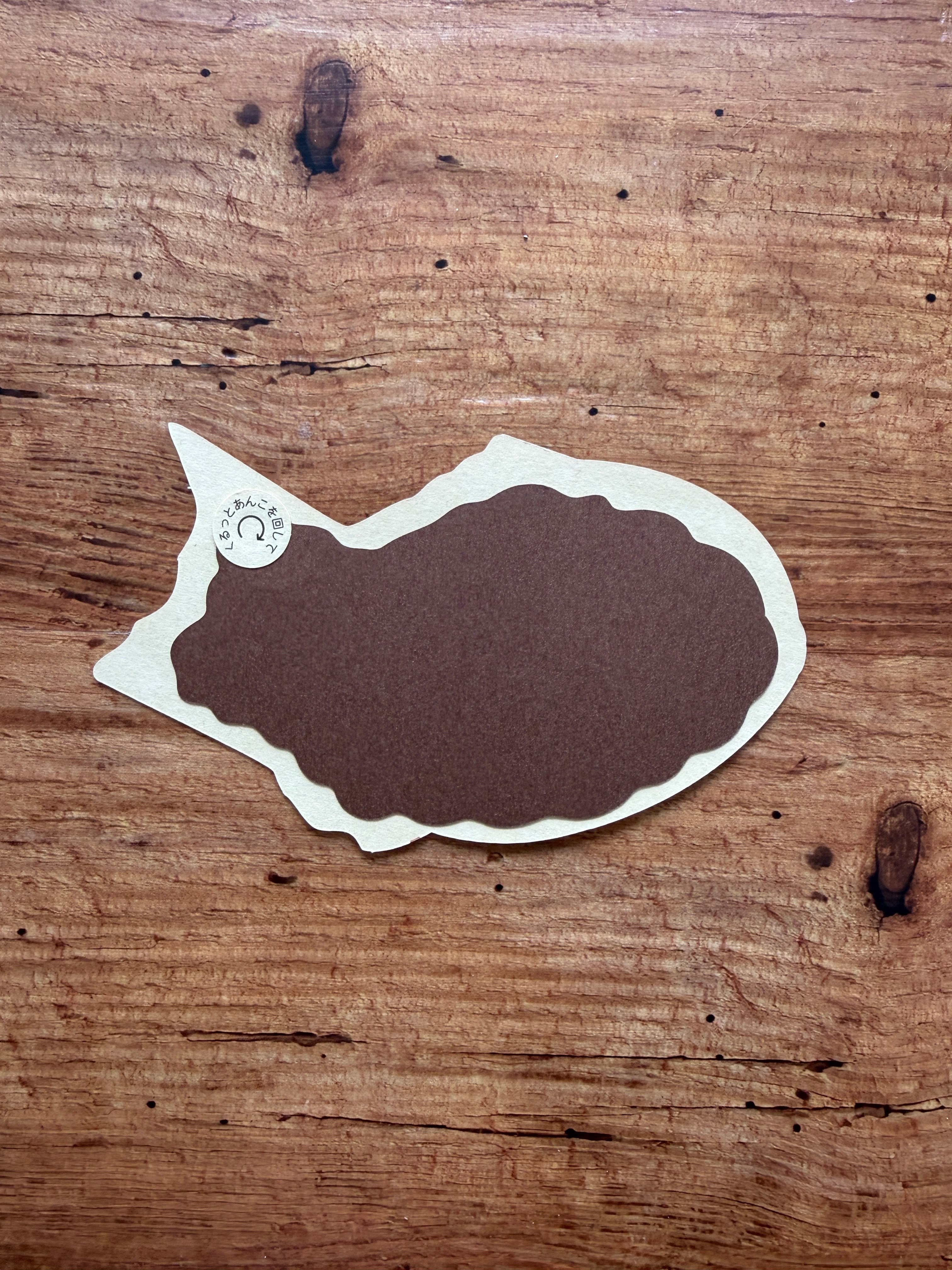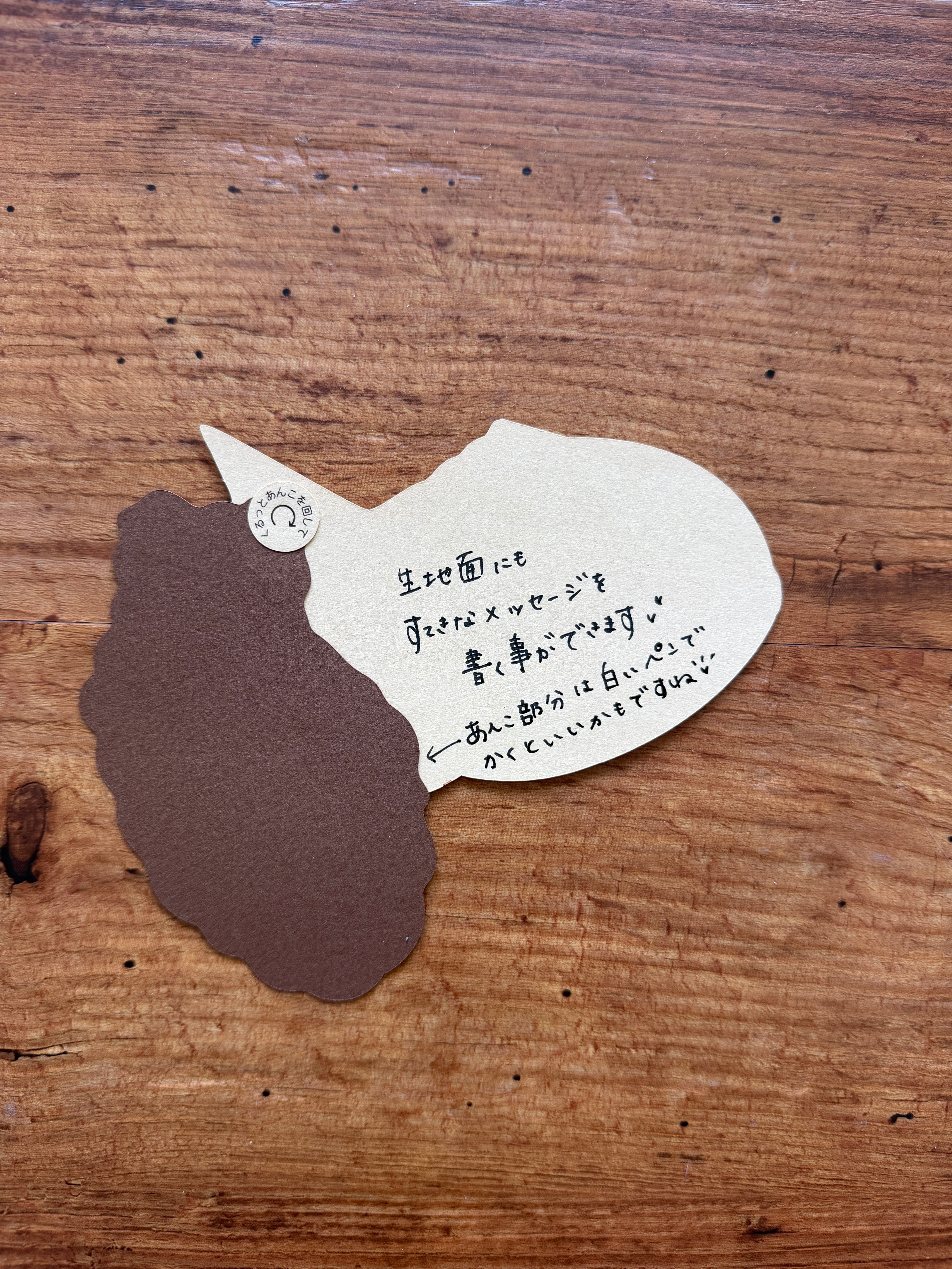 背面のあんこをイメージしたこげ茶色の容姿部分には白いペンでメッセージやタイトルを記入して、生地面にもメッセージを描くことができます。